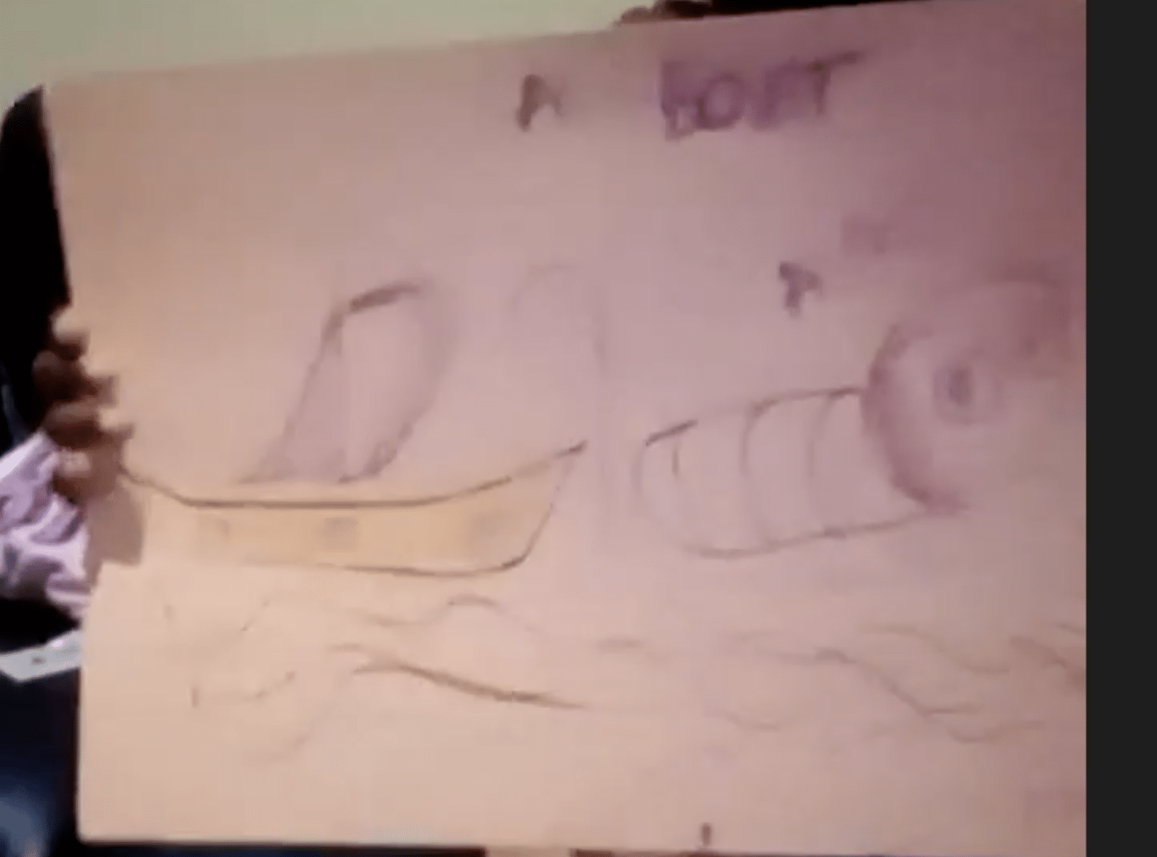 ‘I drew a boat and a bee and these are the plastic bottles under neath the sea. I saw a bee too and I think the bee is distracting the boat.’