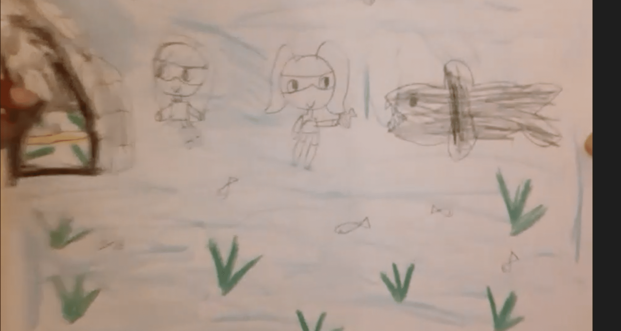 ‘I drawed that I was distracting the shark by giving him a fish and Adeelah was sneaking to get the treasure but this is the shark!’