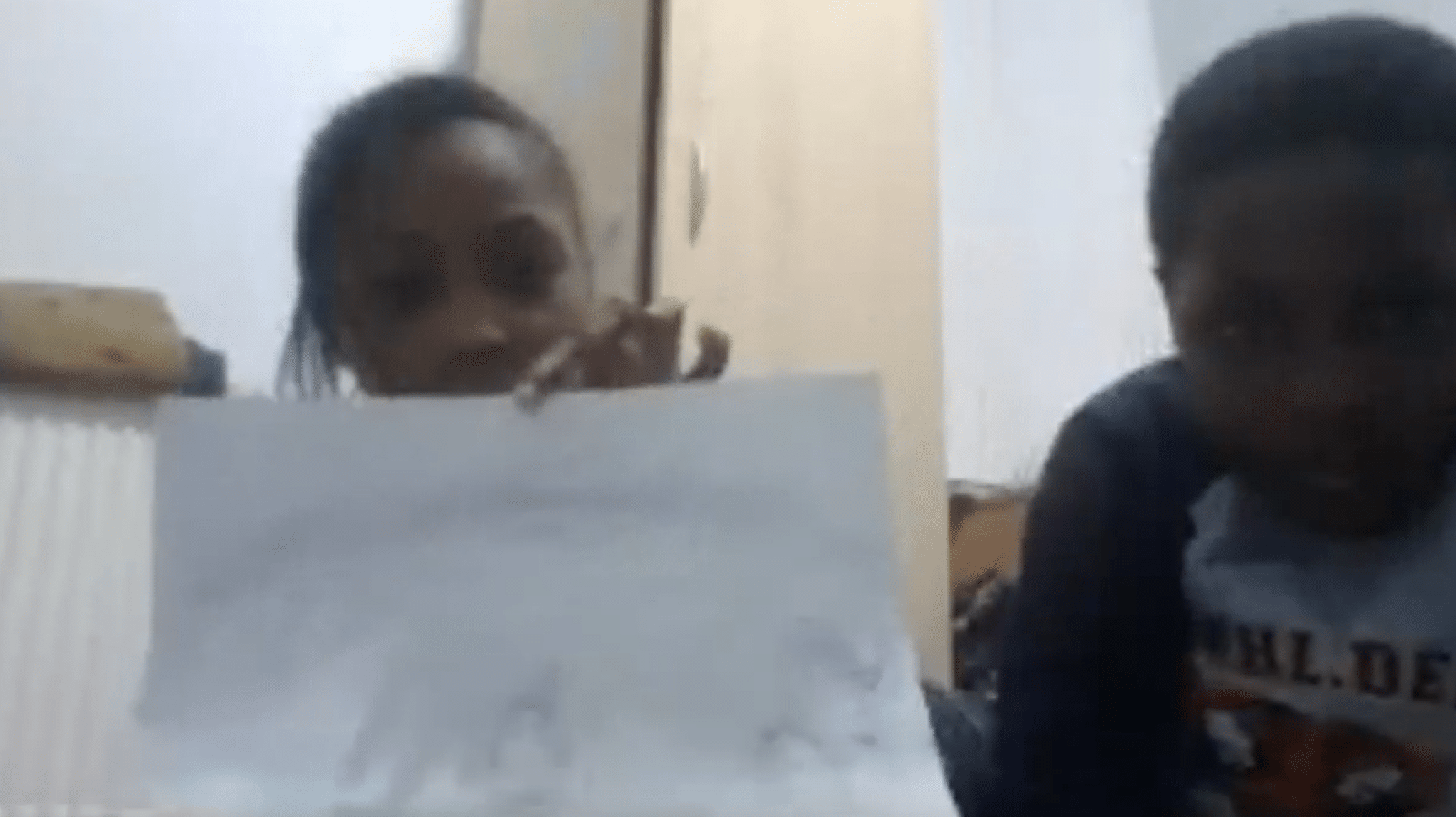 ‘My favourite part of my drawing is the part the bit where we used the glass to distract the shark. And those are us and this is the glass to distract the shark. And that’s the shark, and some treasure and the fish. I’m not done with it but I tried!’