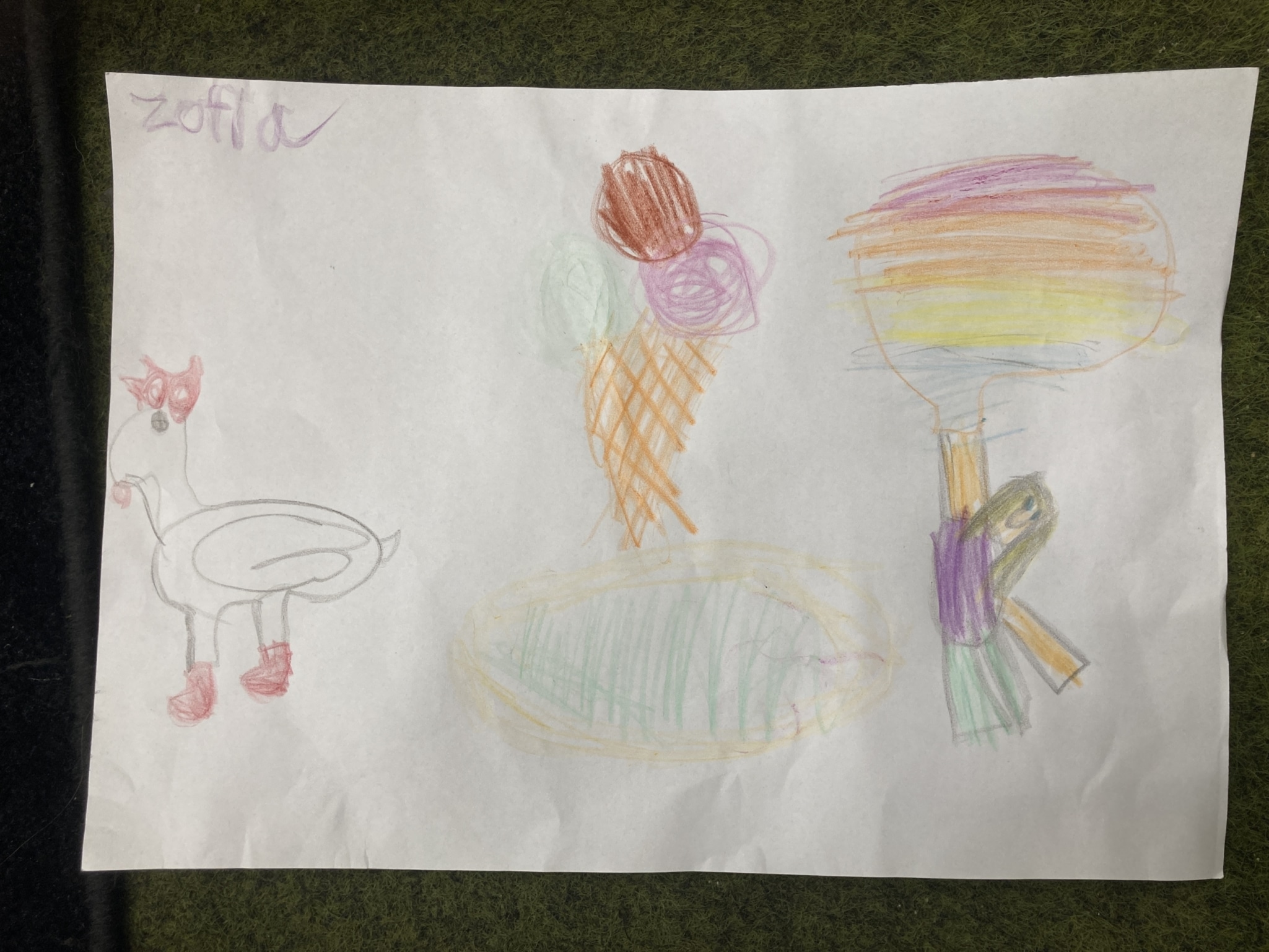 I drew the Funky chicken, ice creams from the ice-cream dragon and all the flavours. This is me with my balloon. My favourite thing today was Funky Chicken.