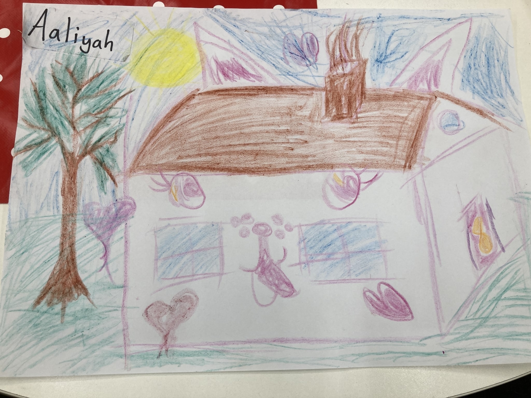 “I drew my dad and a house and we went inside the house and played games and watched tv the house has a face and there is a beautiful sunny day.”