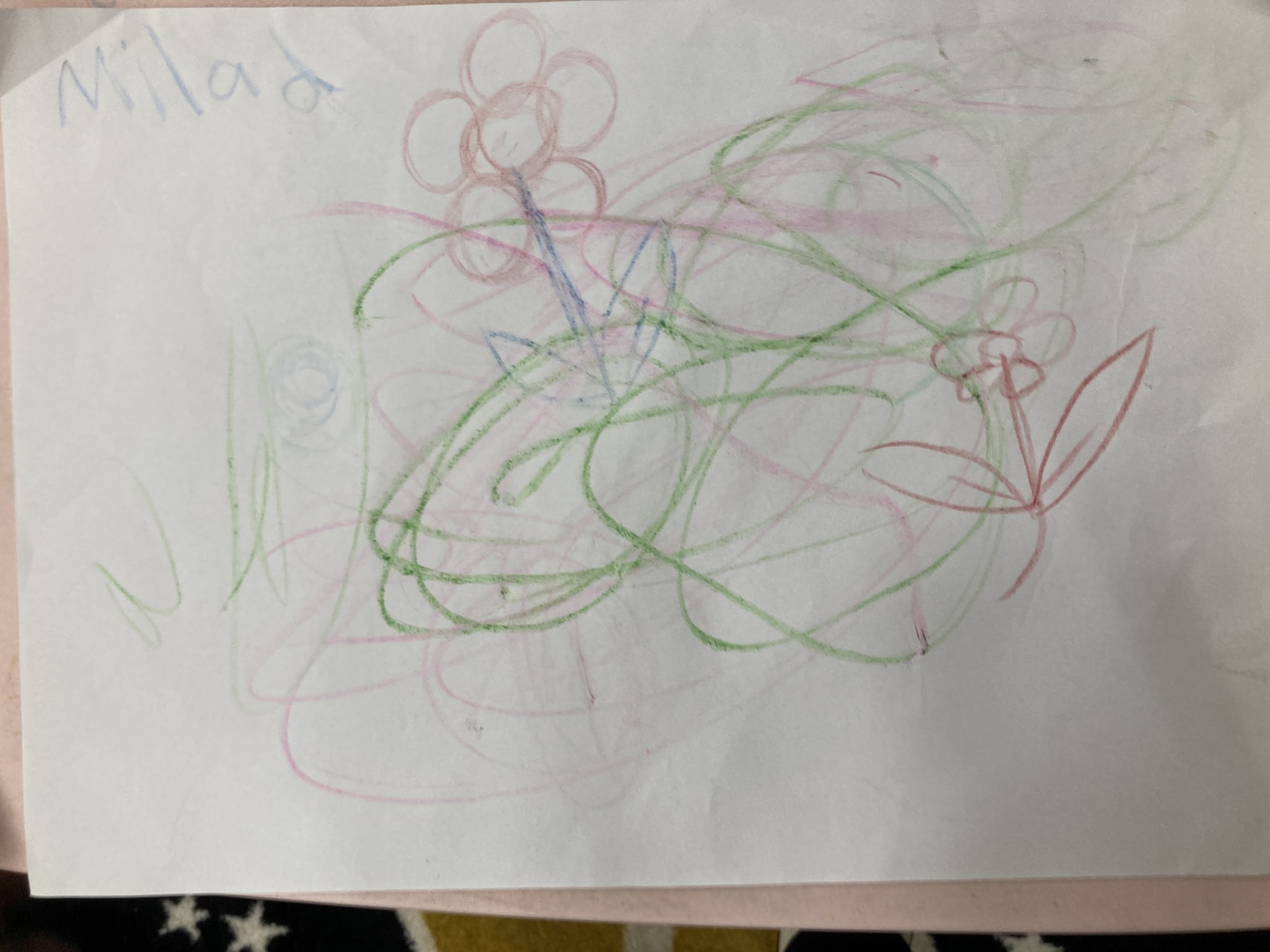 “That’s me skateboarding – I drew Bronwen on the skateboard – she’s very good at skateboarding – these are flowers here. I’m skating on the grass”